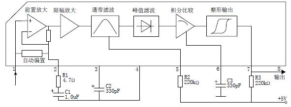濾波器中心頻率f0 的外部電阻。積分電容C3 取330pF。經(jīng)CX20106 處理后的脈沖信號(hào)由