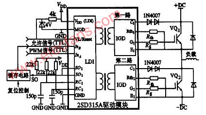 在該應(yīng)用中,MOD 引腳接GND ,選定半橋工作模式: InA 定義為PWM 信號(hào)輸入, InB 為“允許”信號(hào),輸出的兩路驅(qū)動(dòng)信號(hào)自動(dòng)產(chǎn)生由RC 網(wǎng)絡(luò)確定的死區(qū)時(shí)間,以確保上下IGBT (VQ1 和VQ2 ) 不會(huì)同時(shí)導(dǎo)通。VL/ Reset 引腳接4. 7V 齊納二極管的負(fù)極,選定TTL 工作模式: InA 與InB 都采用TTL邏輯電平控制。