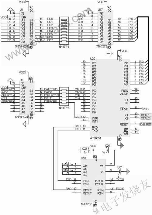 (2)信號預(yù)處理。采集系統(tǒng)不能影響控制設(shè)備和打印機正常工作,因此需要對并行口輸入信號進行緩沖及光電隔離。緩沖芯片選擇74HC245,光耦選擇6N137。