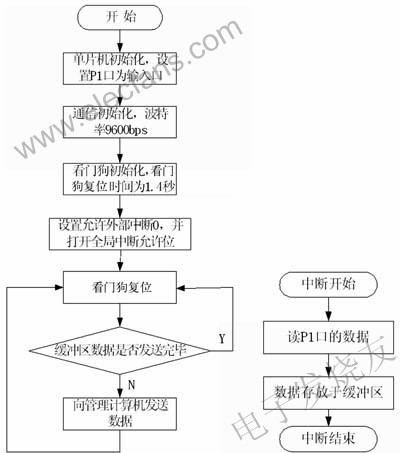 圖4為單片機程序流程圖,程序由主程序和中斷服務(wù)程序構(gòu)成。其中,中斷服務(wù)程序負責(zé)及時采集接受控制設(shè)備發(fā)送到并行口的有效數(shù)據(jù),并存放于緩沖區(qū)。主程序主要負責(zé)與管理PC機進行串行通信,轉(zhuǎn)發(fā)緩沖區(qū)中的數(shù)據(jù)。這樣,管理PC機只需要用可視化編程語言實現(xiàn)一