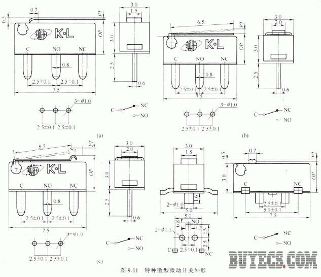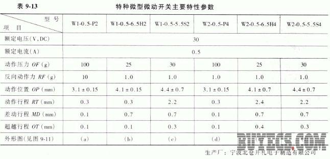 特種微型微動(dòng)開(kāi)關(guān)的主要特性參數(shù)見(jiàn)表9-13 ,它們的外形結(jié)構(gòu)如圖9-11 所示。