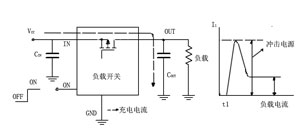 如果在負載開關(guān)與負載之間接了一個大容量電容,如圖3所示。當這電容的等效串聯(lián)電阻非常小時,在負載開關(guān)導(dǎo)通的瞬間,有較大的瞬態(tài)電流(沖擊電流,如圖3右圖所示)流過開關(guān)管。為減小沖擊電流,在負載開關(guān)中增加了C1及R2,如圖4所示。當負載開關(guān)在導(dǎo)通后的瞬間,輸入電壓經(jīng)P管后加在C1及R2上(Q1的導(dǎo)通電阻略而不計),其電壓主要降在R2上,減小了-VGS,減小ID電流,即減小沖擊電流。C1≤1000pF,R1=10~47kΩ,R2=1~4.7kΩ。