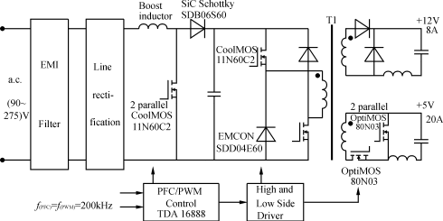 作為范例,本文擬向讀者介紹利用上述器件綜合制成的一個(gè)工作頻率為200kHz,功率為200W的符合環(huán)保要求的實(shí)用型開關(guān)電源。它采用第二代的CoolMOSC2作為PFC和PWM的功率開關(guān),采用SiC肖特基二極管作為PFC二極管,OptiMOS作為同步整流開關(guān),PFC和PWM的控制由同一塊ICTDA16888實(shí)現(xiàn)。該電源具有寬的輸入電壓范圍(90V~275V),80%以上的AC/DC變換效率。輸出電壓有兩組:+5V/20A和+12V/8.3A,帶有輸出過(guò)載保護(hù)和輸出短路保護(hù)。所有功率器件均無(wú)須加散熱片,也不要求接最小的輸出負(fù)載。
