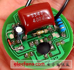 做好的LED燈不但很輕不容易摔壞,而且亮度相當于5W的節(jié)能燈還很漂亮哦!制作注意事項:請仔細多次核對后通電試驗,注意人身安全,謹防觸電!常見故障:因為這款燈的LED數(shù)量眾多,很容易因為其中一個LED損壞或者LED管腳和PCB焊接不良造成全部不亮,所以制作成功的關(guān)鍵還是在焊接LED時務(wù)必認真仔細!排查的方法如下:用萬用表直流250V電壓檔測量每個LED兩端的電壓,(測量時千萬注意安全,此時整個電路板和交流市電沒有隔離,觸碰板上零件有觸電危險!)如 果發(fā)現(xiàn)某個LED兩端的電壓異常大,說明開路點就在附近(如LED裝反、LED管芯開路、LED焊盤齊根處PCB短路、LED虛焊等等)最有效的辦法就是 用直流電壓試通電點亮LED測試,先徹底斷開交流電源!然后如用10V左右的直流電壓,4個LED串連后通電測試,可以快速判斷出故障。