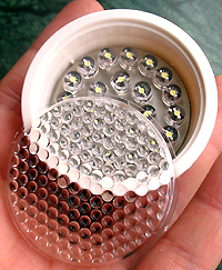 請 一定要選用不漏電的30W尖頭電烙鐵焊接,注意焊接要干脆果斷,焊接時間不能過長,控制在2秒以內(nèi),否則LED有可能被焊壞!焊接時必須注意LED的極 性,引腳長的那根插入PCB上標有+的孔中,千萬不能插反!焊接技巧:先點焊一下一根LED的引腳,然后融化焊錫,將LED緊貼PCB并扶正,再焊接另一 根引腳,再剪掉多余的引腳。紅色的四個LED必須焊接到板子的中間(我們按紅色LED設(shè)計工作電流的)藍色和綠色采用間隔的方式焊接在周圍,見上圖。