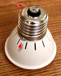 從電源板上標有“交流入”的兩處焊盤處引出兩根軟線,一根和外殼焊接,另一根和中心電極焊接,焊接點如上圖紅色箭頭位置。最后熱溶膠分別固定羅口燈座、電源板、LED燈板和均光板,防止晃動和意外短路。