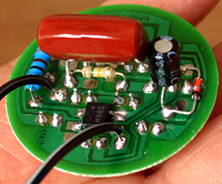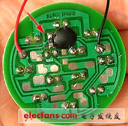 然 后焊接82K(823)貼片電阻,上圖紅色箭頭位置,先焊接貼片電阻的一端,扶正位置后焊接另外一端,焊接完成后用數(shù)字萬用表測量電阻應(yīng)該在60K左右, 注意貼片電阻下面還有一根引線,可以測量一下是否有短路?現(xiàn)在我們可以進行一次測試,見上圖,紅線接5~6V直流電壓,黑線接負極,這時LED彩燈應(yīng)該能 正常工作了,這說明直流部分一切正常啦!