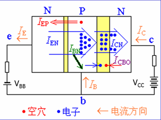 在發(fā)射結(jié)正偏,集電結(jié)反偏條件下,三極管中載流子的運動:(1)在VBB作用下,發(fā)射區(qū)向基區(qū)注入電子形成IEN,基區(qū)空穴向發(fā)射區(qū)擴散形成IEP。(2) 電子在基區(qū)復(fù)合和擴散,由發(fā)射區(qū)注入基區(qū)的電子繼續(xù)向集電結(jié)擴散,擴散過程中少部分電子與基區(qū)空穴復(fù)合形成電流IBN。由于基區(qū)薄且濃度低,所以IBN較小。(3) 集電結(jié)收集電子,由于集電結(jié)反偏,所以基區(qū)中擴散到集電結(jié)邊緣的電子在電場作用下漂移過集電結(jié),到達(dá)集電區(qū),形成電流ICN。(4) 集電極的反向電流,集電結(jié)收集到的電子包括兩部分:發(fā)射區(qū)擴散到基區(qū)的電子——ICN,基區(qū)的少數(shù)載流子——ICBO