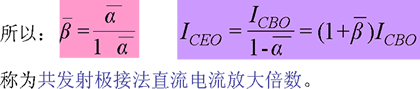 稱為共基極直流電流放大系數(shù)。它表示最后達(dá)到集電極的電子電流ICN與總發(fā)射極電流IE的比值。ICN與IE相比,因ICN中沒有IEP和IBN,所以 的值小于1, 但接近1,一般為0.98~0.999 。由此可得: