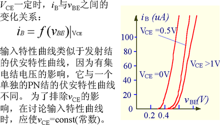 (2) VCE>1V時,b、e間加正向電壓,這時JE正偏, JC反偏。發(fā)射區(qū)注入到基區(qū)的載流子絕大部分被JC收集,只有小部分與基區(qū)多子形成電流IB。所以在相同的VBE下,IB要比VCE=0V時小。VCE>1V: iB比VCE=0V時小