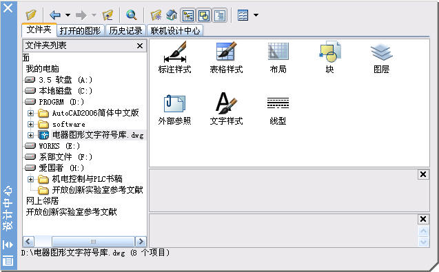 ????????選擇菜單項(xiàng)“工具” ∣“設(shè)計(jì)中心”,或單擊標(biāo)準(zhǔn)工具欄上“設(shè)計(jì)中心”快捷按鈕,AutoCAD2006彈出“設(shè)計(jì)中心”窗口。