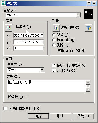 ???????塊的命名應(yīng)具有一定的含義并方便記憶,例如主觸頭塊名取為KMM-3V(KM表示接觸器,M表示主觸頭, 3表示3極,V表示豎式布置),單擊“拾取點(diǎn)”按鈕后,在AutoCAD繪圖界面中拾取圖中第1條豎線的上端點(diǎn)作為塊基點(diǎn),自動(dòng)回到“塊定義”對(duì)話框。
