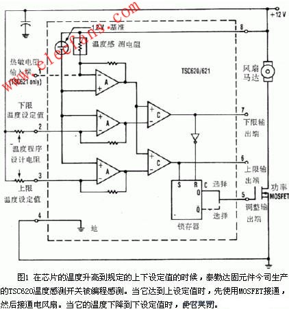 ????? 圖1,在芯片的溫度升高到規(guī)定的上下設(shè)定值的時(shí)候,泰勤達(dá)因元件公司生產(chǎn)的TSC620溫度感測(cè)開關(guān)被編程感測(cè)。當(dāng)它達(dá)到上設(shè)定值時(shí),先使MOSFET接通,然后接通電風(fēng)扇。當(dāng)它的溫度下降到下設(shè)定值時(shí),使它關(guān)閉。