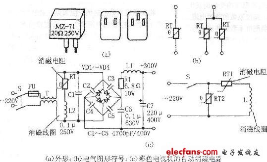? ? ? M272-75型正溫度系數(shù)熱敏電阻的外形、電氣圖形符號(hào)、文字符號(hào)及彩色電視機(jī)的自動(dòng)消磁電路如下圖所示。M272-75型熱敏電阻性能參數(shù)見下表所示。