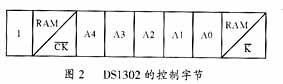 2.2 DS1302的控制字節(jié) ????DS1302 的控制字如圖2所示??刂谱止?jié)的最高有效位(位7)必須是邏輯1,如果它為0,則不能把數(shù)據(jù)寫入DS1302中,位6如果為0,則表示存取日歷時(shí)鐘數(shù)據(jù),為1表示存取RAM數(shù)據(jù);位5至位1指示操作單元的地址;最低有效位(位0)如為0表示要進(jìn)行寫操作,為1表示進(jìn)行讀操作,控制字節(jié)總是從最低位開始輸出。