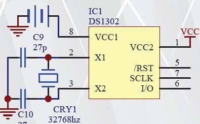 ds1302引腳功能及結(jié)構(gòu) ????圖1示出DS1302的引腳排列,其中Vcc1為后備電源,VCC2為主電源。在主電源關(guān)閉的情況下,也能保持時(shí)鐘的連續(xù)運(yùn)行。DS1302由Vcc1或Vcc2兩者中的較大者供電。當(dāng)Vcc2大于Vcc1+0.2V時(shí),Vcc2給DS1302供電。當(dāng)Vcc2小于Vcc1時(shí),DS1302由Vcc1供電。X1和X2是振蕩源,外接32.768kHz晶振。RST是復(fù)位/片選線,通過(guò)把RST輸入驅(qū)動(dòng)置高電平來(lái)啟動(dòng)所有的數(shù)據(jù)傳送。RST輸入有兩種功能:首先,RST接通控制邏輯,允許地址/命令序列送入移位寄存器;其次,RST提供終止單字節(jié)或多字節(jié)數(shù)據(jù)的傳送手段。當(dāng)RST為高電平時(shí),所有的數(shù)據(jù)傳送被初始化,允許對(duì)DS1302進(jìn)行操作。如果在傳送過(guò)程中RST置為低電平,則會(huì)終止此次數(shù)據(jù)傳送,I/O引腳變?yōu)楦咦钁B(tài)。上電運(yùn)行時(shí),在Vcc≥2.5V之前,RST必須保持低電平。只有在SCLK為低電平時(shí),才能將RST置為高電平。I/O為串行數(shù)據(jù)輸入輸出端(雙向),后面有詳細(xì)說(shuō)明。SCLK始終是輸入端。
