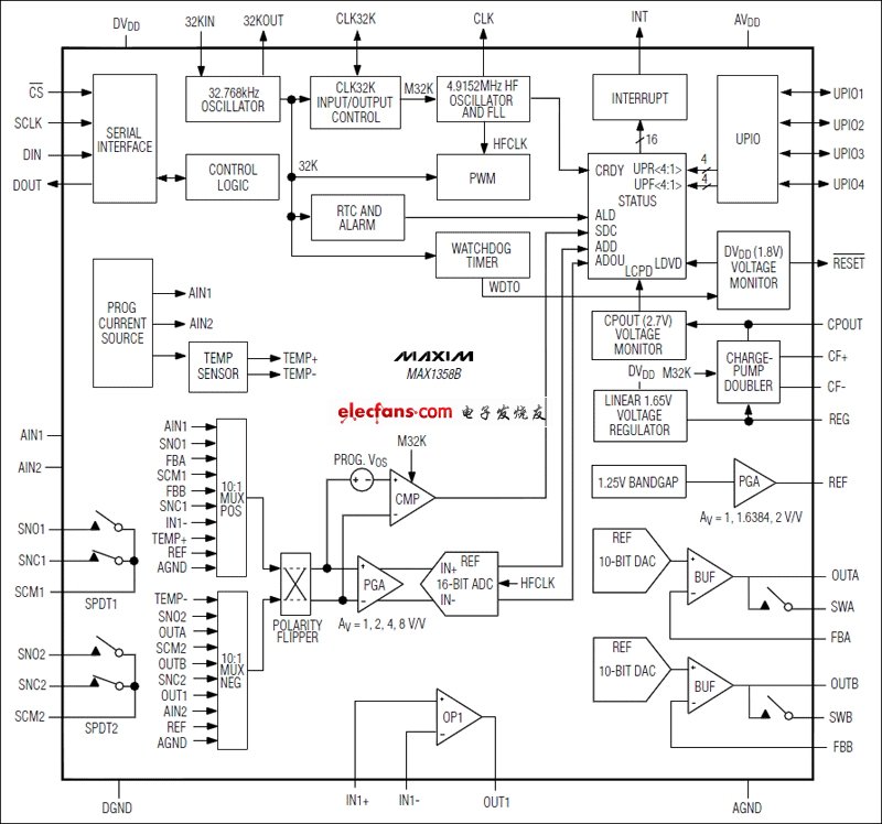 MAX1358B帶有兩路10:1差分輸入復用器(mux),可接受0至AVDD的信號電平。片上1倍至8倍可編程增益放大器(PGA)用于測量低壓信號,減少了所需的外部電路。