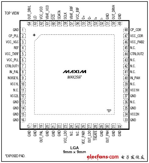 MAX2597工作在-40°C至+85°C擴展級溫度范圍,采用帶裸焊盤(EP)的9mm x 9mm x 1.4mm fcLGA封裝。