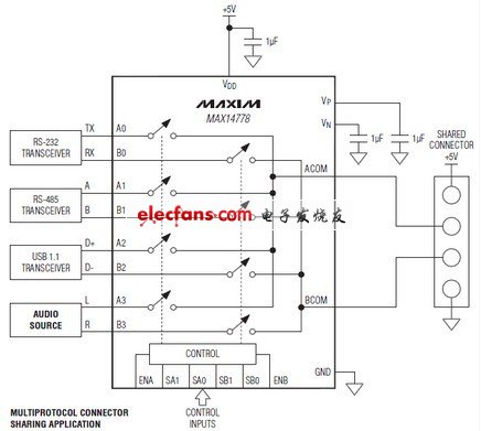 MAX14778支持全速USB1.1信號(hào)(12Mbps)和RS- 485的數(shù)據(jù)傳輸速率高達(dá)20Mbps的開關(guān)。