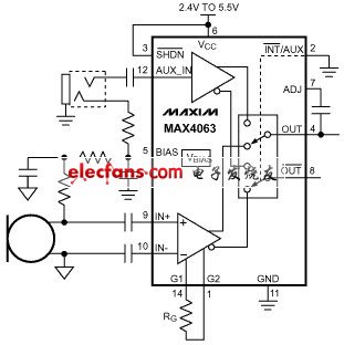 MAX4063是一款專為高性能便攜式應(yīng)用優(yōu)化設(shè)計的差分輸入麥克風(fēng)前置放大器。該器件具有兩路可選輸入、差分輸出、可調(diào)增益、集成低噪聲偏置源以及低功耗關(guān)斷模式等特性。兩個輸入通道分別用于差分和單端麥克風(fēng)輸入。差分輸入具有很高的噪聲抑制能力,特別適合于內(nèi)部麥克風(fēng),可有效避免系統(tǒng)噪聲和PCB上的長線傳輸對于低電平信號的損傷。單端輸入用于連接外部麥克風(fēng)非常簡便。