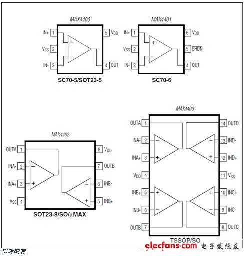 MAX4400的單放大器是在超小型5引腳SC70和節(jié)省空間的5引腳SOT23封裝。單MAX4401包括關機功能,可在6引腳SC70。MAX4402是雙放大器提供8引腳SOT23,μMAX?封裝和SO封裝。MAX4403四通道放大器在一個14引腳TSSOP封裝或SO封裝。