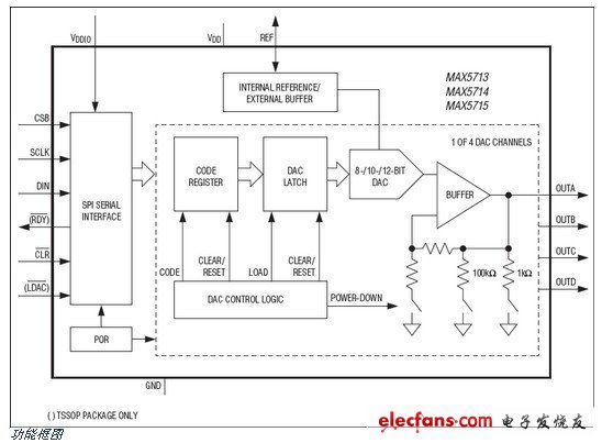 MAX5713/MAX5714/MAX5715 4通道,低功耗,8/10/12位,電壓輸出數(shù)字-模擬轉(zhuǎn)換器(DAC),包括輸出緩沖器的選擇是2.048V內(nèi)部參考,2.500V或4.096V。在MAX5713/MAX5714/MAX5715接受寬電源電壓范圍為2.7V至5.5V的極低功耗(3MW)的消費(fèi)量,以適應(yīng)大多數(shù)低電壓應(yīng)用。精密的 ??外部基準(zhǔn)輸入允許軌到軌運(yùn)行,并提出一個(gè)100kΩ(典型值)負(fù)載到一個(gè)外部參考。MAX5713/MAX5714/MAX5715有一個(gè)50MHz的3線SPI / QSPI?/ MICROWIRE?/ DSP兼容的串行接口,其中還包括一個(gè)菊花鏈應(yīng)用RDY輸出低電平有效。DAC輸出緩沖,并具有低電源電流小于百分之250FA通道和低偏移誤差±為0.5mV(典型值)。MAX5713/MAX5714/MAX5715上電時(shí),該DAC輸出復(fù)位到零,為應(yīng)用程序提供額外的安全性,需要上電驅(qū)動(dòng)閥門或其它傳感器。內(nèi)部參考最初掉電允許使用外部參考。MAX5713/MAX5714/MAX5715允許同時(shí)使用軟件LOAD命令或硬件負(fù)載DAC邏輯輸入(低電平有效LDAC)的輸出更新。 輸入(低電平有效CLR)的一個(gè)清晰的邏輯,使“守則”的內(nèi)容和DAC寄存器異步清零和DAC輸出設(shè)置為零。MAX5713/MAX5714/MAX5715是在一個(gè)14引腳TSSOP和超小型,12焊球WLP封裝,在-40℃至+125°C溫度范圍內(nèi)指定。