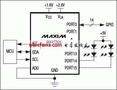 MAX7304組成的16個端口的GPIO12推挽GPIO和4個漏極開路PWM控制的LED驅(qū)動器配置的GPIO,。該器件支持1.62V至3.6V電平轉(zhuǎn)換的單獨的電源。一個地址選擇輸入(AD0)允許最多四個設(shè)備的唯一的從屬地址。