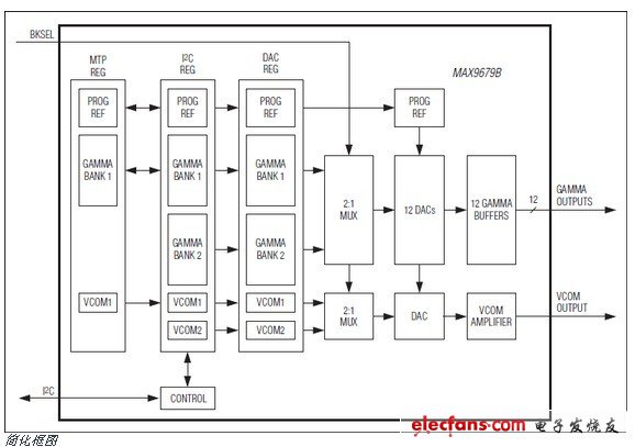 MAX9679B提供多個可編程參考電壓,在TFT液晶顯示器的伽馬校正和可編程參考電壓的VCOM調節(jié)。所有gamma和VCOM參考電壓有10位數(shù)字-模擬轉換器(DAC)和高電流的緩沖區(qū),從而降低了輸出電壓的臨界水平和模式恢復時顯示。一個可編程內部參考的DAC的滿量程電壓設置。 兩個伽瑪曲線和VCOM的代碼獨立集可以存儲在IC的揮發(fā)性記憶體; BKSEL信號兩套之間的選擇。 該IC多時間可編程模式(MTP)內存來存儲芯片上的gamma和VCOM代碼,消除外部EEPROM的需求。